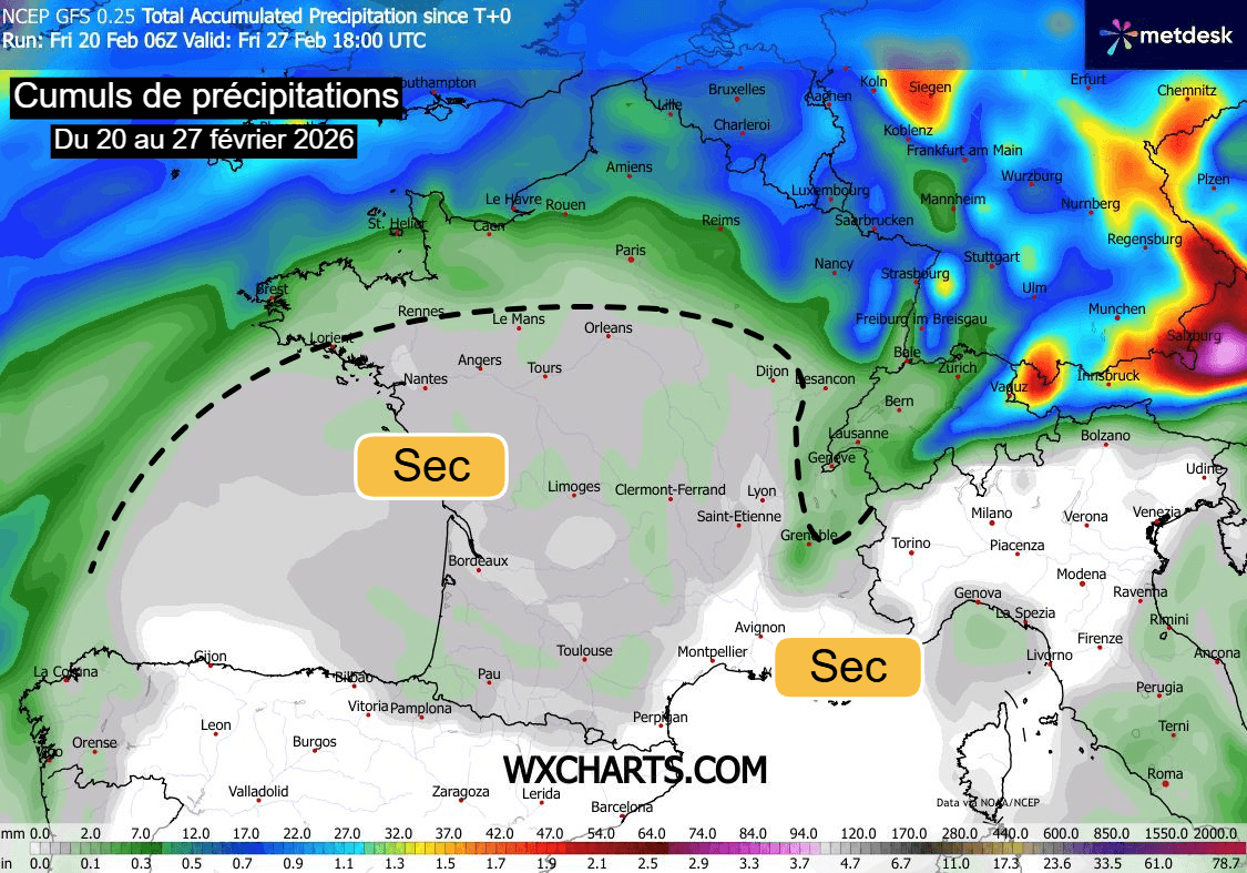 Cumuls de précipitations attendus jusqu'au vendredi 27 février 2026 sur la France – Modèle GFS via meteociel