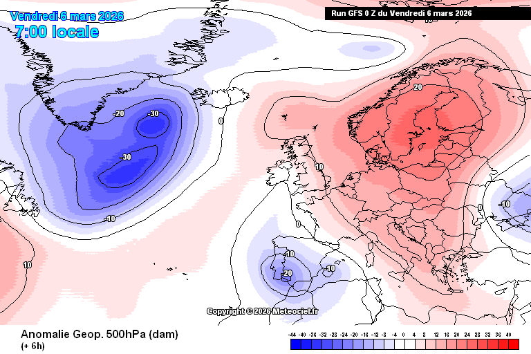 Animation des anomalies de géopotentiels sur l'Europe du 6 au 12 mars 2026 – Modèle GFS via meteociel