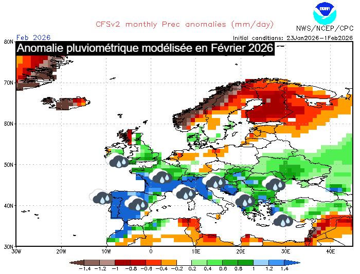 Anomalie pluviométrique envisagée en Europe pour le mois de février 2026 - NOAA