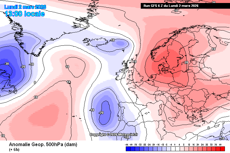 Anomalies de géopotentiels sur l'Europe du 2 au 8 mars 2026 – Modèle GFS via meteociel