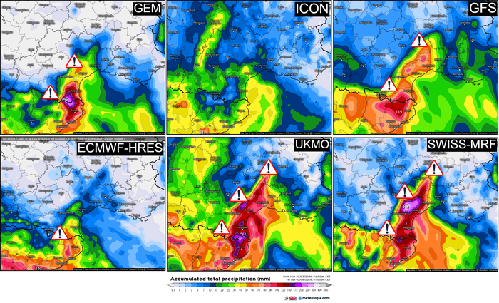 Différents scénarios concernant les cumuls de pluie d'ici le week-end sur le sud-est de la France – Via meteologix
