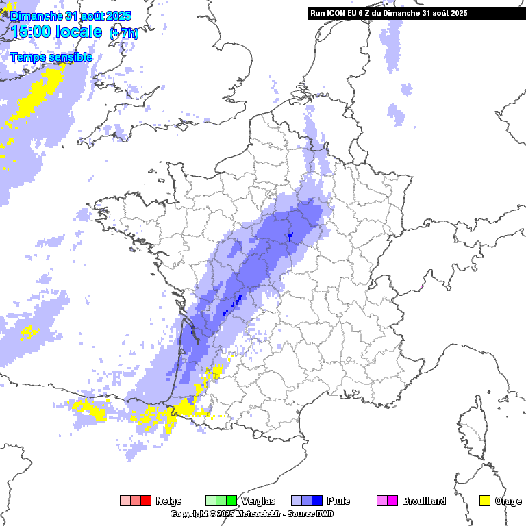 Selon la simulation du modèle allemand icône, on voit clairement une réactivation de la perturbation océanique au fur et à mesure de sa progression vers l'est dans l'après-midi de dimanche (d'où cette vigilance entre le Puy-de-Dôme et la Côte-d'Or avec un risque d'orage de grêle).