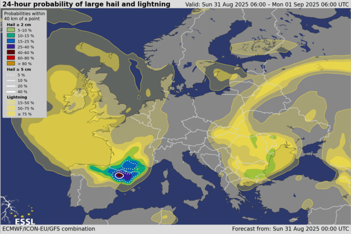 Risque orageux et de grêle en Europe dans la journée de dimanche - modèle météo européen