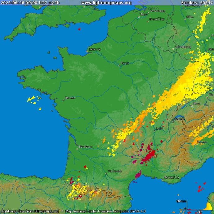 Impacts de foudre observés ce dimanche 26 juin 2022 - via lightningmaps.com
