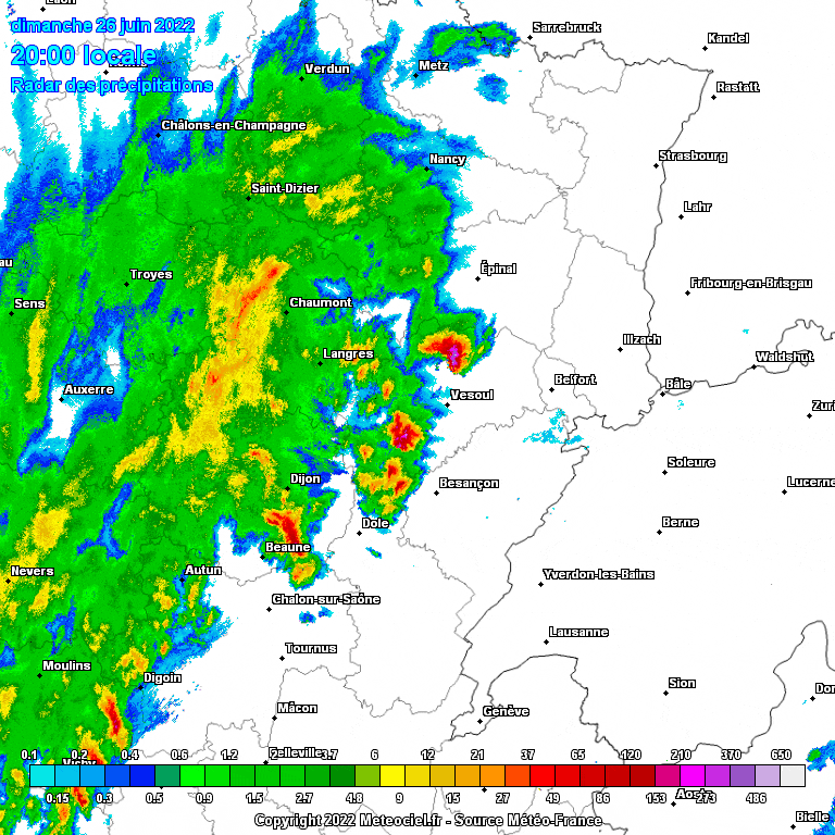 Dans ce contexte très instable, les orages pré-frontaux (éclatant à l'avant immédiat du front froid) ont été particulièrement virulents ce dimanche 26 juin 2022 durant la soirée. Une succession de cellules orageuses de nature supercellulaire a été observée depuis la Saône-et-Loire vers le nord de la Franche-Comté, les Vosges et l'Alsace, comme l'illustrent les images radar ci-dessous (grêle sous les echos en rouge et violet).