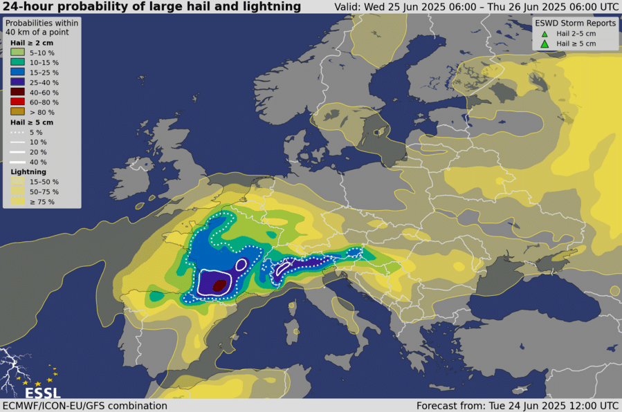 Probabilité de grêle de >2 cm et >5 cm de diamètre ce mercredi 25 juin 2025 - ESSL