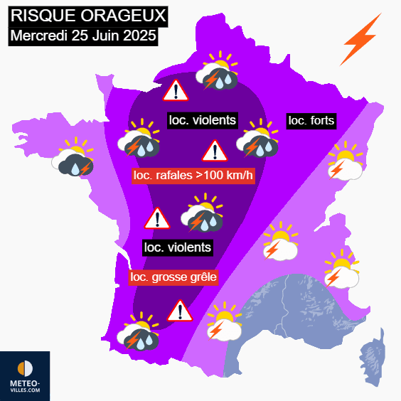 Le risque orageux le plus marqué va se développer en fin d'après-midi et soirée de ce mercredi 25 juin 2025 du sud-ouest au nord de la France. Le risque d'orages violents est notamment présent sur un axe allant du Gers jusqu'à l'Île-de-France et au sud de la Normandie. Sur cette zone, grosse grêle, rafales supérieures à 100 km/h ainsi qu'un foudroiement intense sont redoutés au passage des orages les plus actifs. Des orages forts sont également susceptibles de remonter jusqu'aux frontières du nord en première partie de nuit.