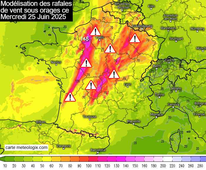 Modélisation des rafales de vent maximales sous orages ce mercredi 25 juin 2025 - meteologix.com