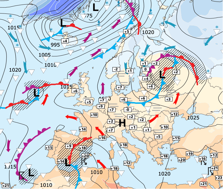 + Lorsque cette dépression se décalera vers l’Italie, elle engendrera un appel d’air froid en provenance de Russie (d’où une baisse des températures par le nord-est de la France à partir de dimanche).