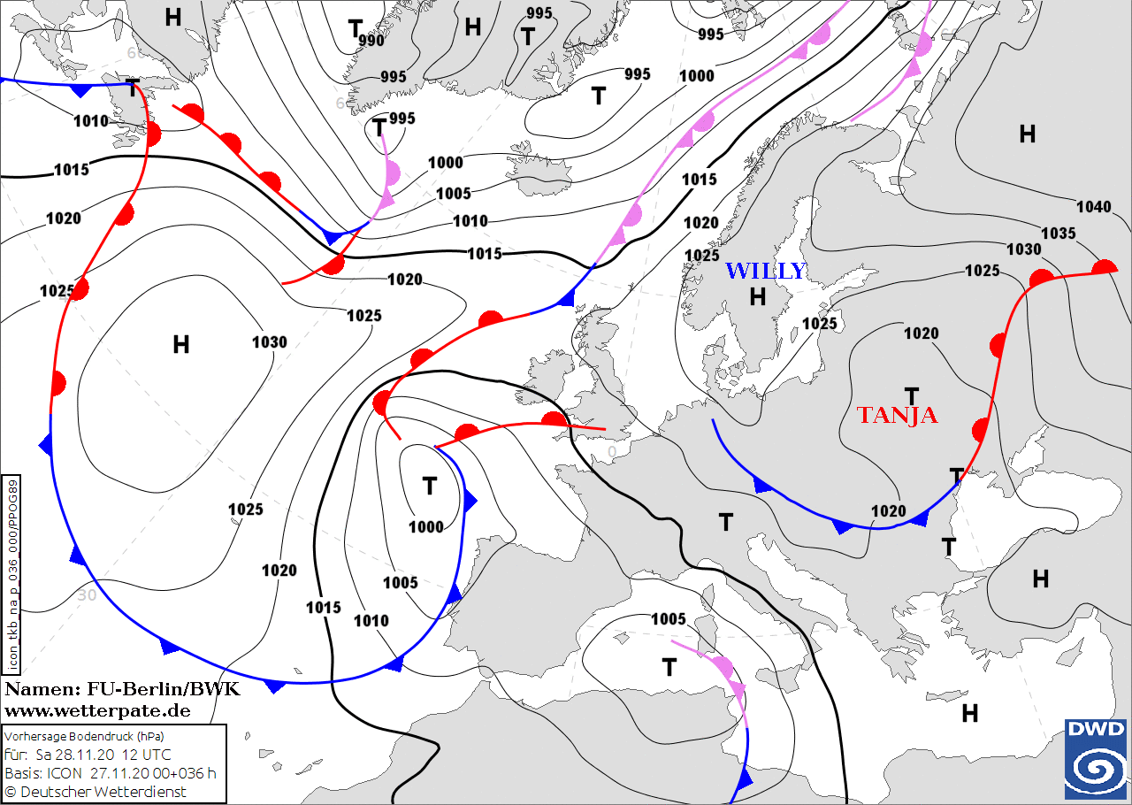 Noms des dépressions et anticyclones prévus pour samedi 28 novembre 2020 à midi (Berlin)