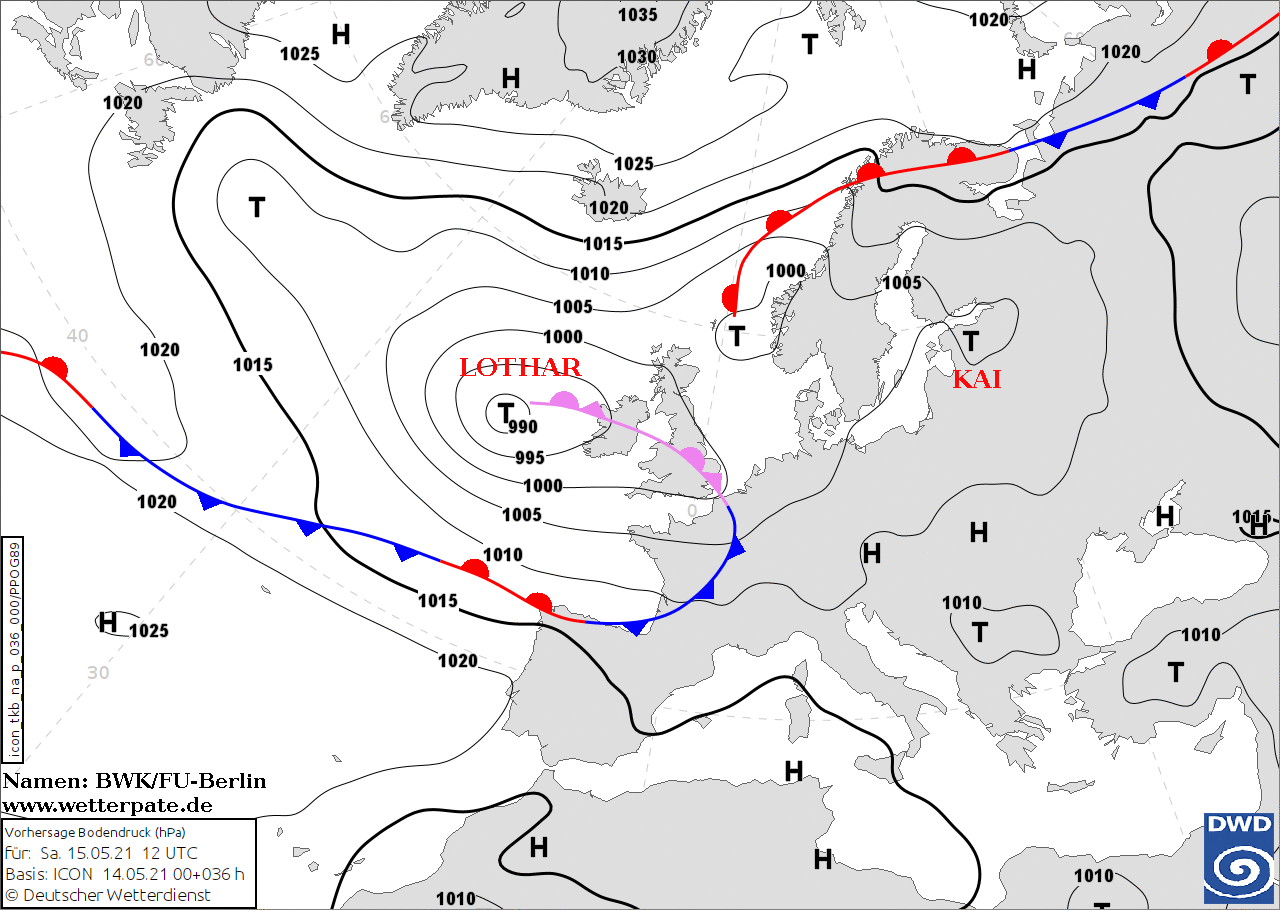 Noms des dépressions et anticyclones prévus pour samedi 15 mai 2021 à midi (Berlin)