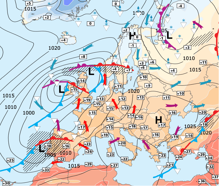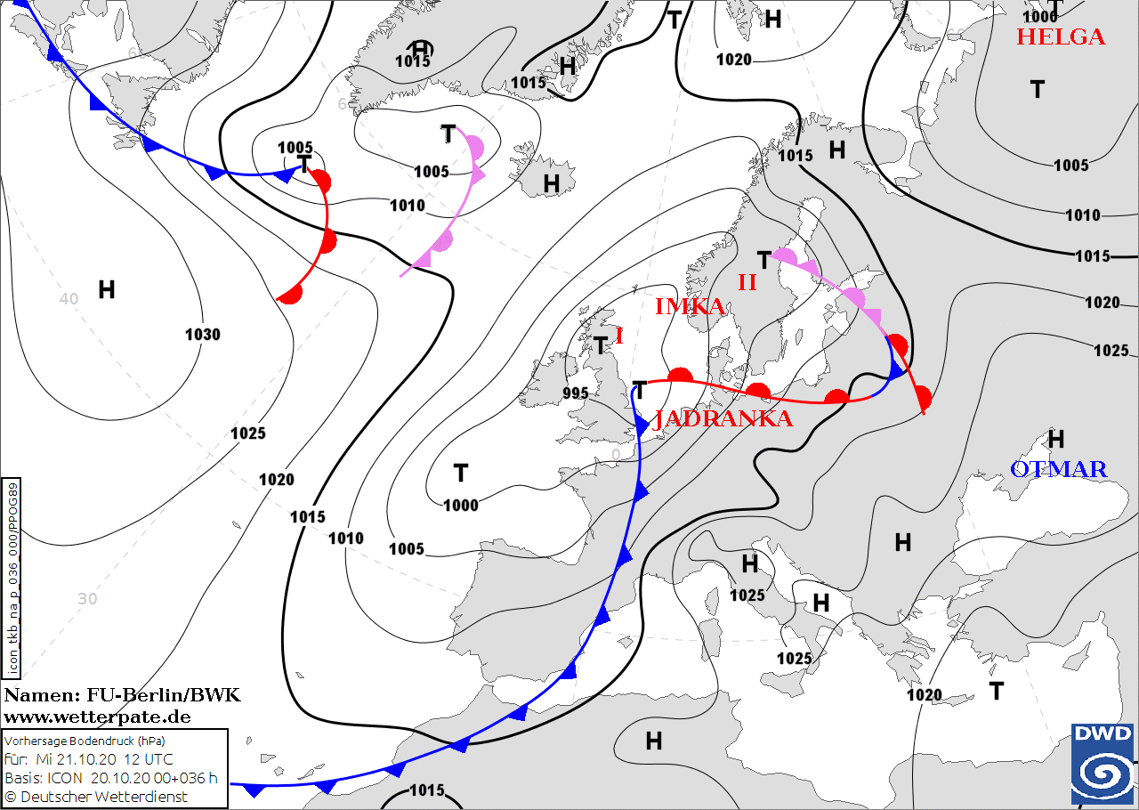 Noms des dépressions et anticyclones prévus pour mercredi 21 octobre 2020 à midi (Berlin)