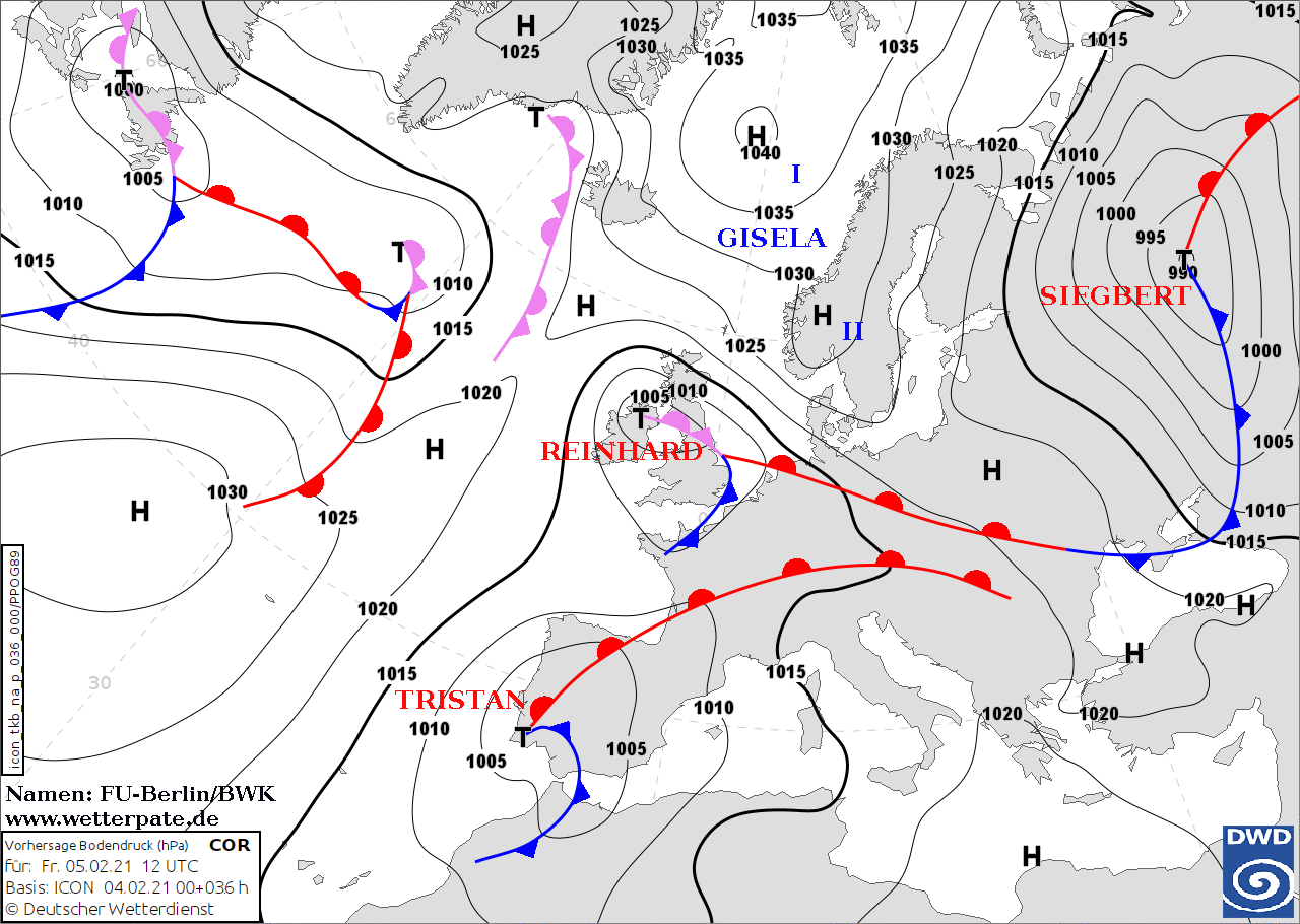 Noms des dépressions et anticyclones prévus pour vendredi 5 février 2021 à midi (Berlin)