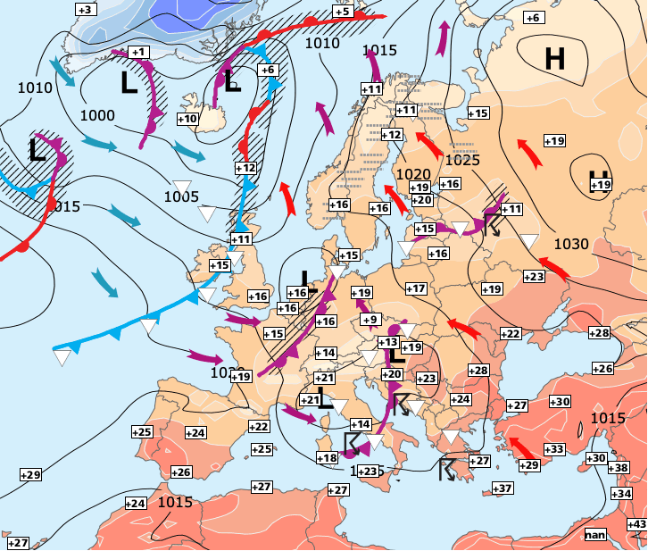 + Comme la goutte froide d’altitude s’évacue progressivement vers l'Europe centrale en se comblant, la situation météo s’améliore par l’ouest avec le retour de l’anticyclone des Açores.