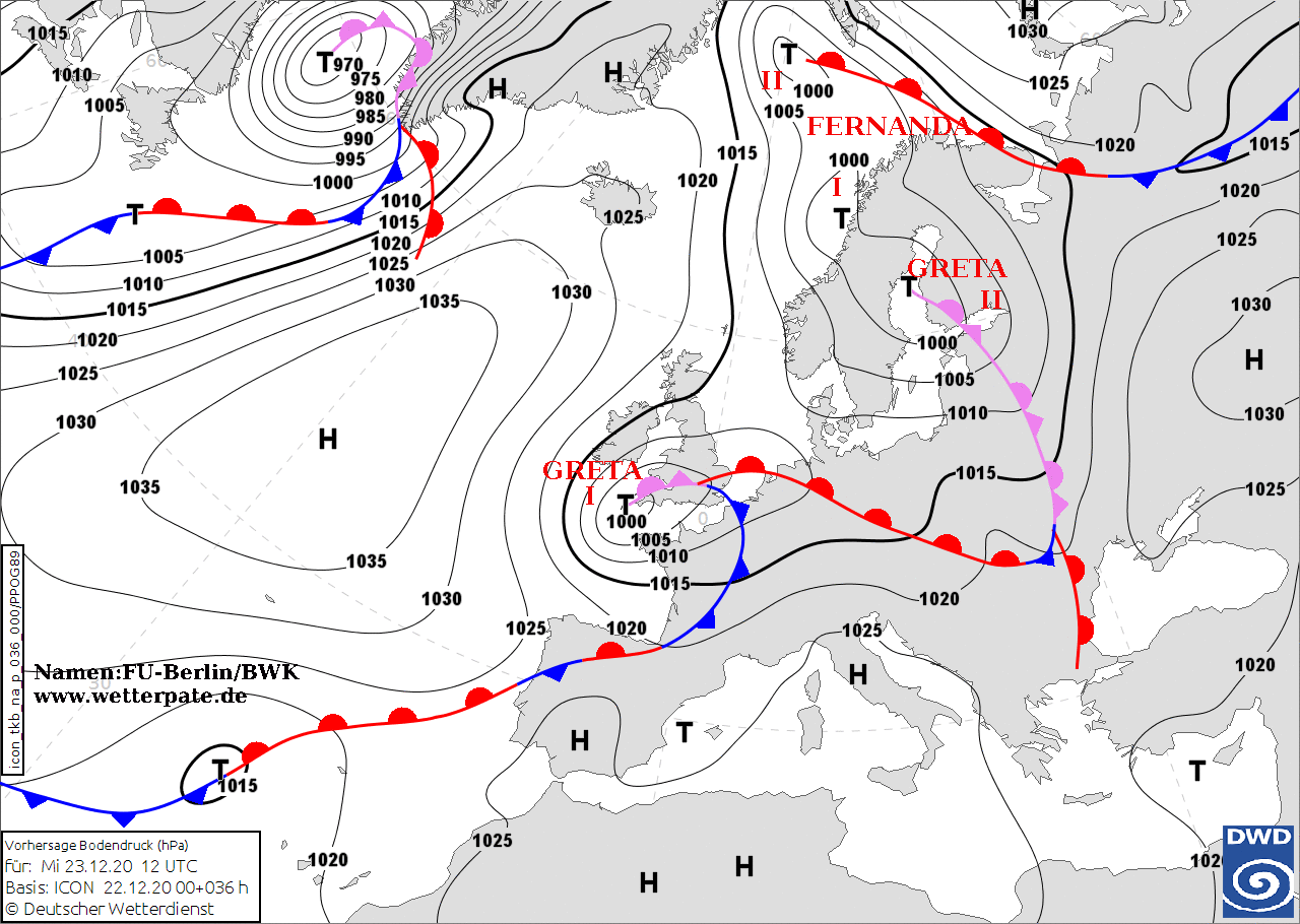 Noms des dépressions et anticyclones prévus pour mercredi 23 décembre 2020 à midi (Berlin)