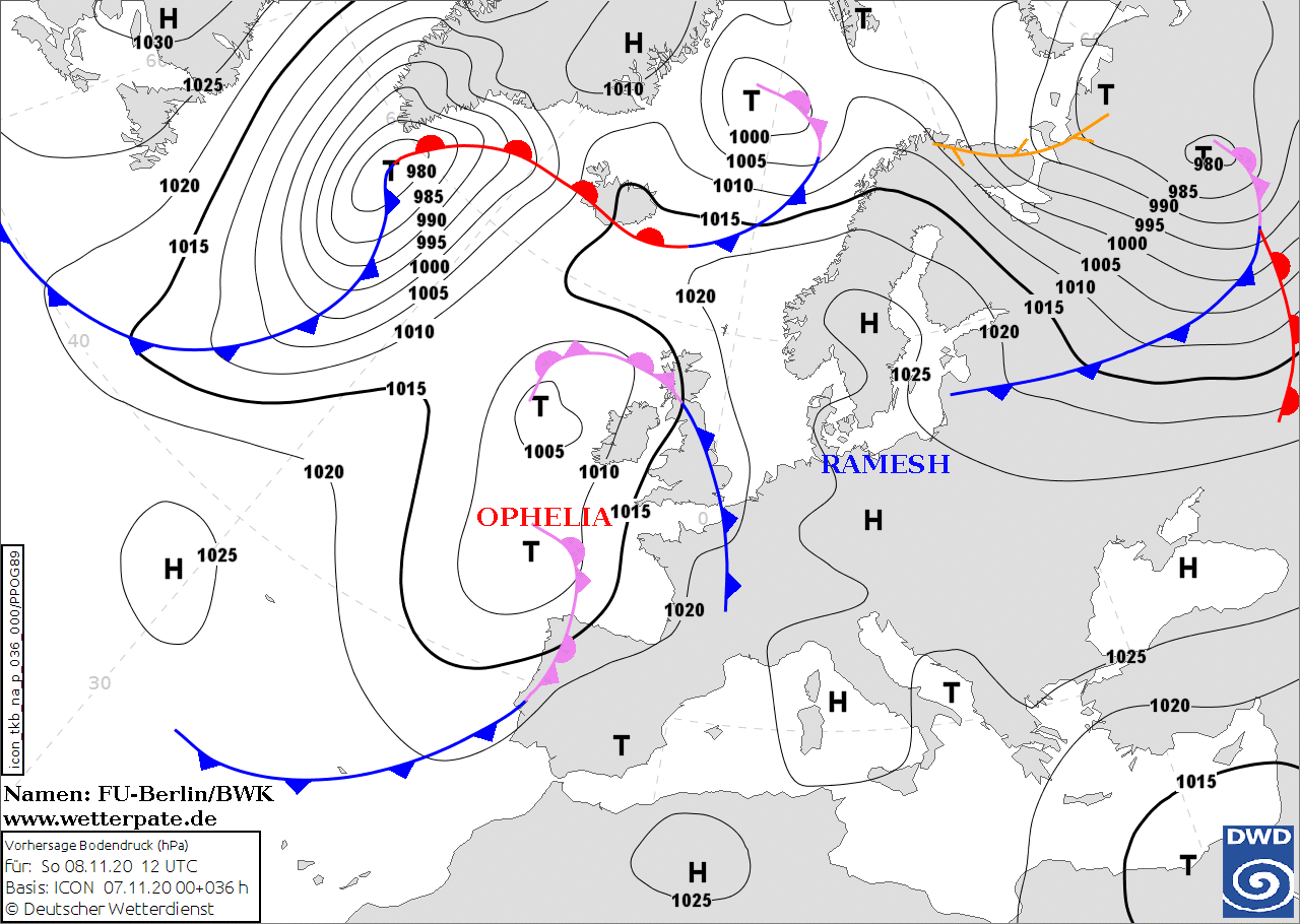 Noms des dépressions et anticyclones prévus pour dimanche 8 novembre 2020 à midi (Berlin)