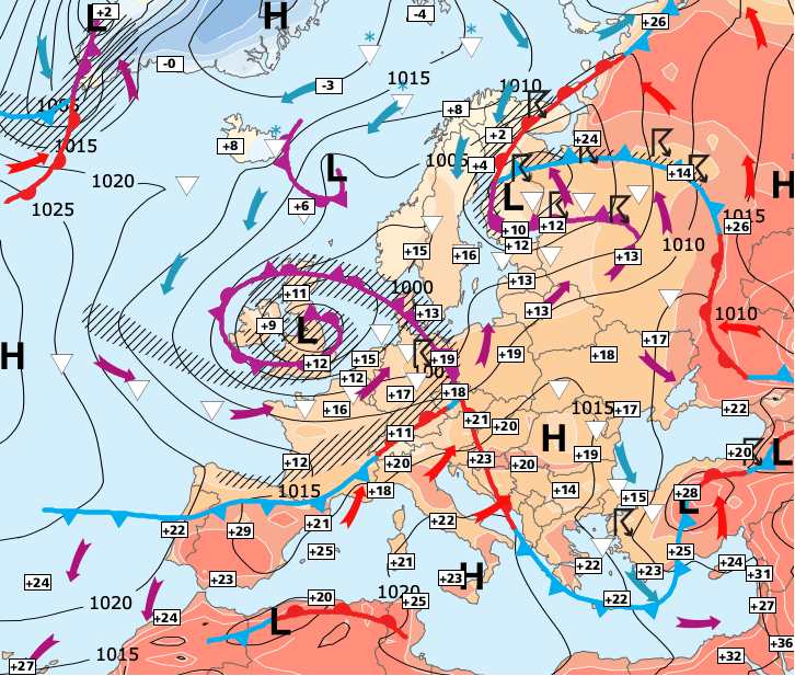 Noms des dépressions et anticyclones prévus pour samedi 22 mai 2021 à midi (Berlin)