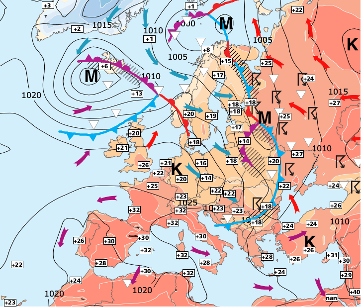 + Cette bouffée d’air très chaud en provenance du Sahara précédera l’incursion d’air plus frais venue de l'Atlantique, d’où la formation de vagues orageuses successives.
