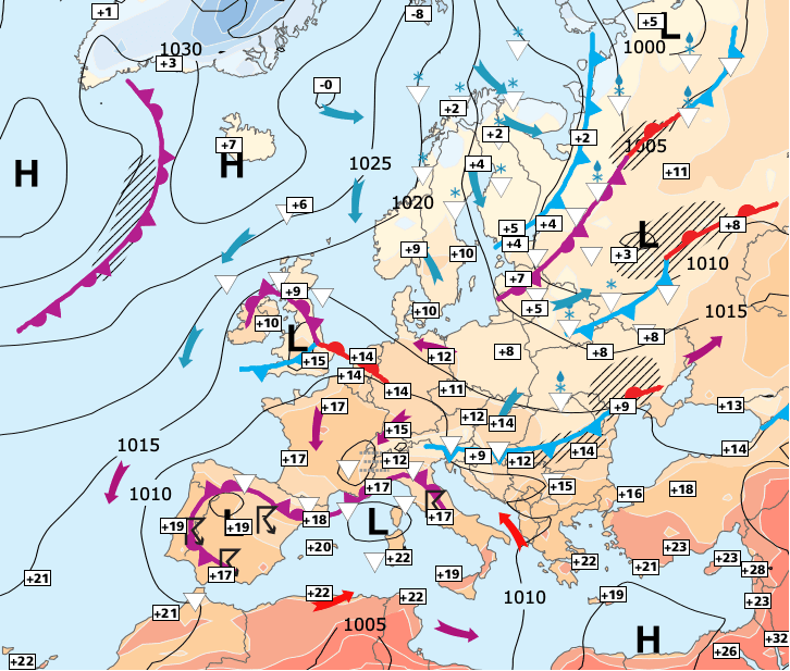 + L’anticyclone qui protégeait jusqu’alors la France s’est éloigné vers le sud de l’Islande et la zone de temps ensoleillé finira par disparaître.