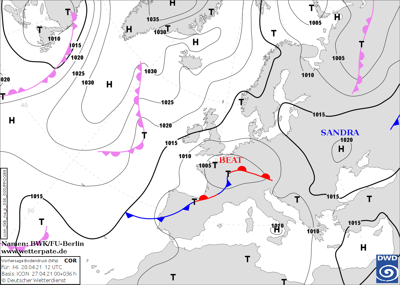 Noms des dépressions et anticyclones prévus pour mercredi 28 avril 2021 à midi (Berlin)