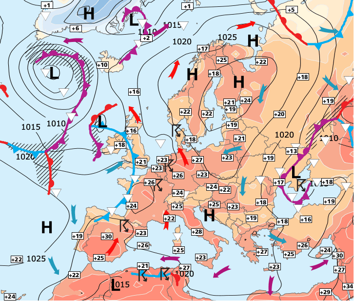 + Samedi et dimanche : L’anticyclone reviendrait déjà par l'ouest, repoussant l'instabilité orageuse vers l'est. Les températures remonteront peu à peu avec une chaleur tout a fait raisonnable.