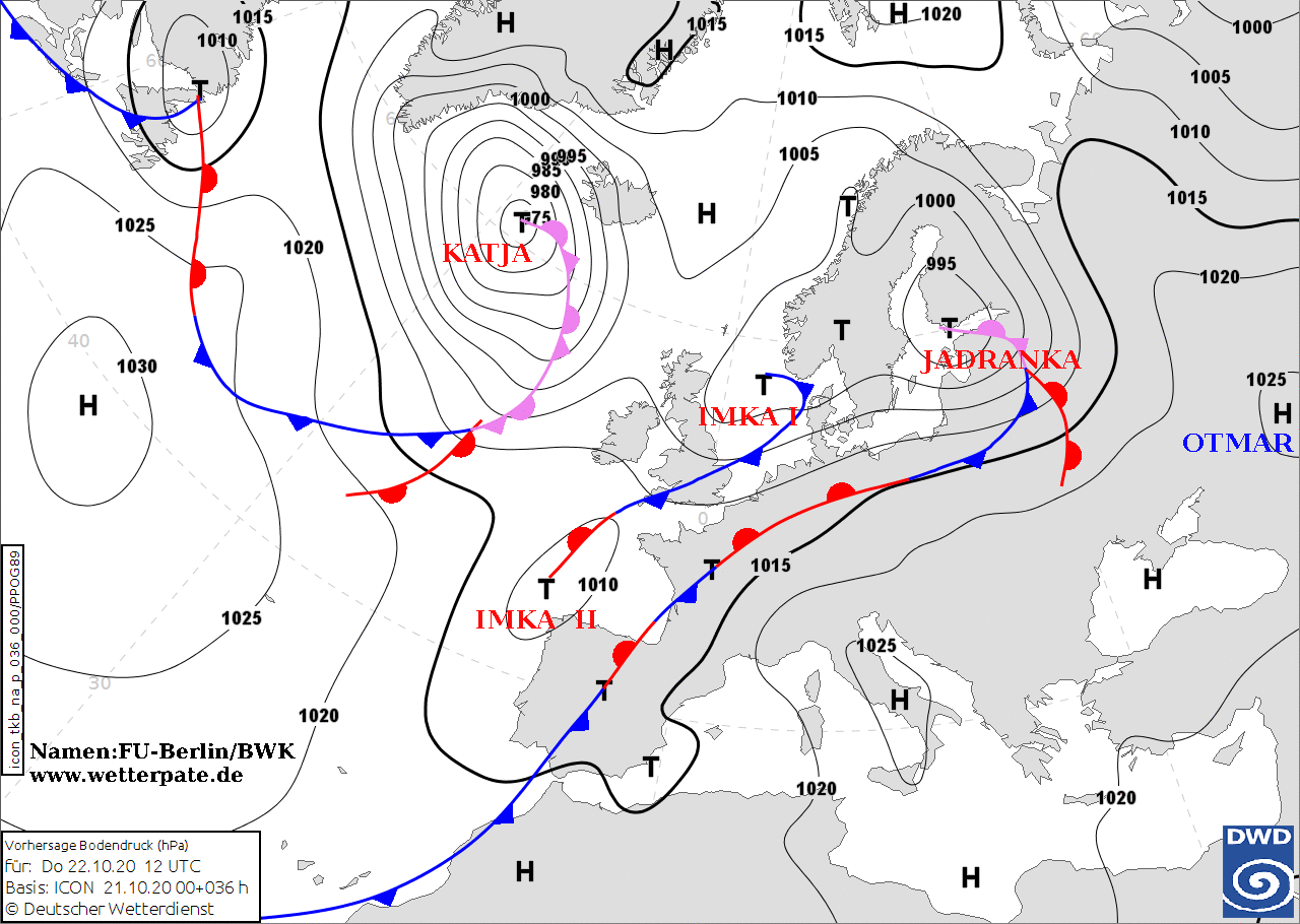 Noms des dépressions et anticyclones prévus pour jeudi 22 octobre 2020 à midi (Berlin)