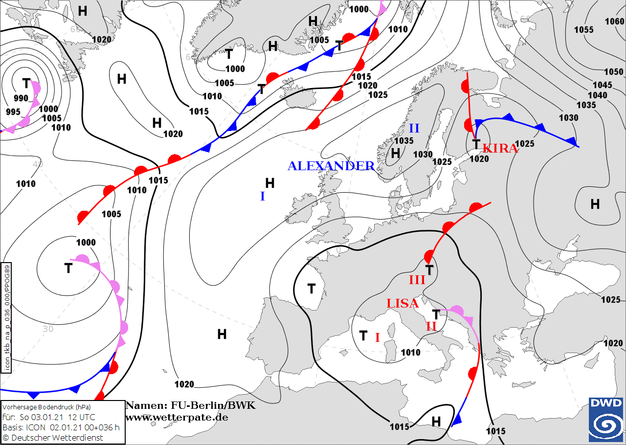 Noms des dépressions et anticyclones prévus pour dimanche 3 janvier 2021 à midi (Berlin)