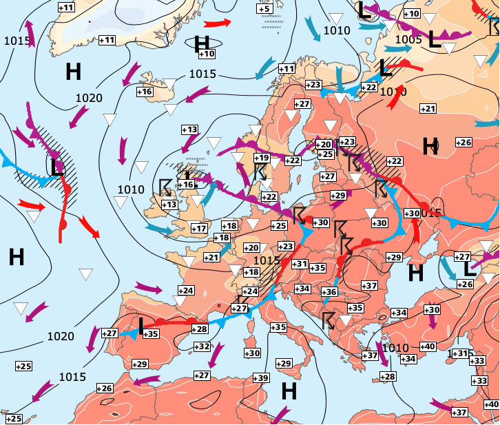 Noms des dépressions et anticyclones prévus pour jeudi 29 juillet 2021 à midi (Berlin)