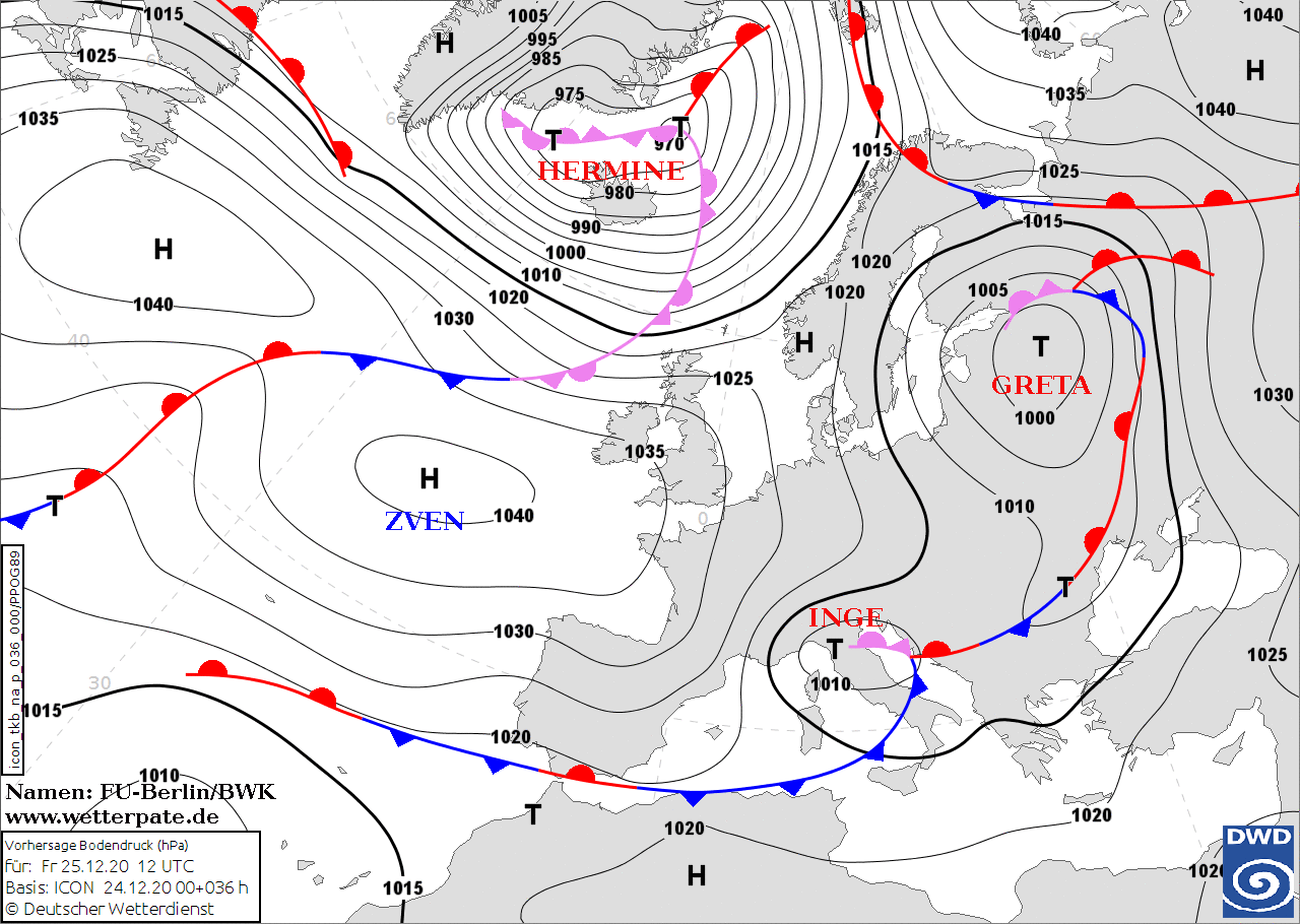 Noms des dépressions et anticyclones prévus pour vendredi 25 décembre 2020 à midi (Berlin)