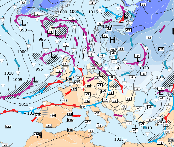 + Après ce week-end printanier, un petit rafraîchissement sera observé lundi - mais la douceur reprendra rapidement le dessus et les journée de mardi et mercredi seront plutôt agréables pour la saison (sauf près de la Manche, située à proximité du courant perturbé britannique).