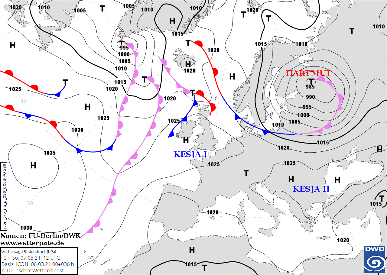 Noms des dépressions et anticyclones prévus pour dimanche 7 mars 2021 à midi (Berlin)