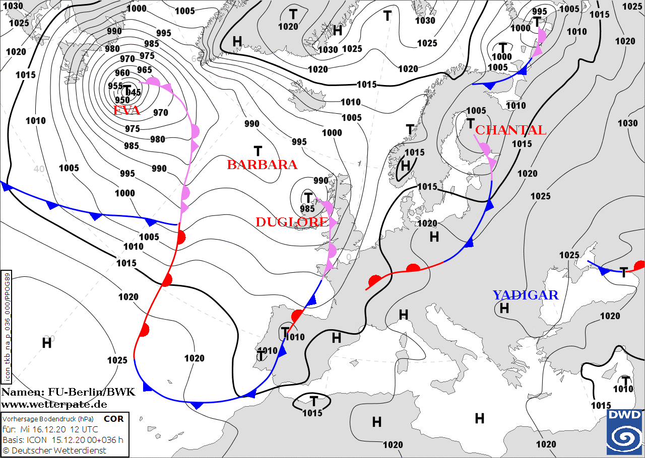 Noms des dépressions et anticyclones prévus pour mercredi 16 décembre 2020 à midi (Berlin)