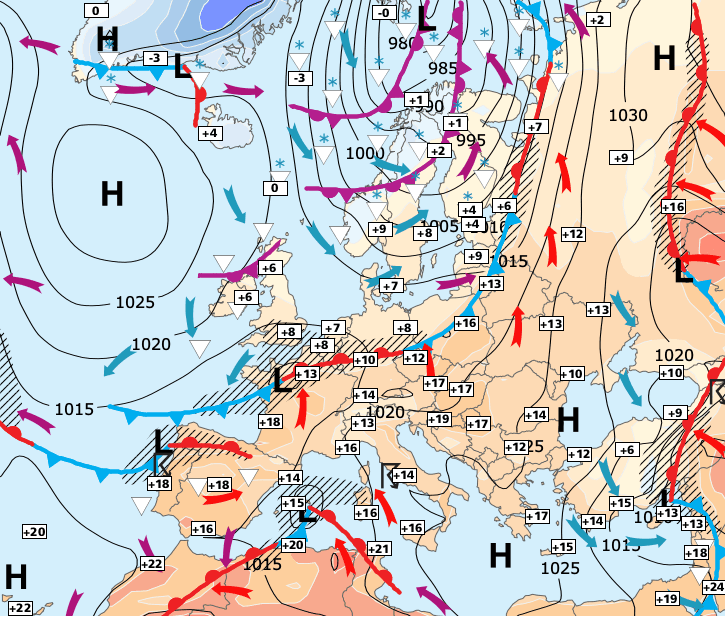 + Après le bras de fer de samedi, l'air froid venu d'Islande et des Iles britanniques finit par l'emporter et repoussera la perturbation fortement pluvieuse vers un axe allant des Pyrénées aux régions du Nord-est (puis Est) dans journée e dimanche.