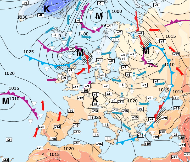 + L'air froid se décale temporairement vers l'Europe de l'Est et la douceur venue d'Espagne gagne nos régions par le Sud-ouest.
