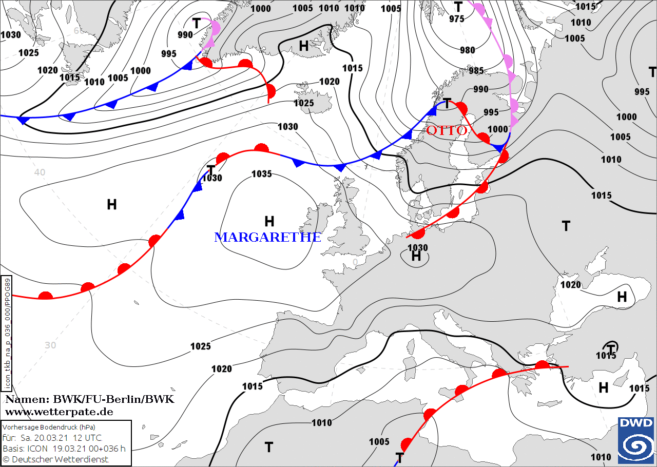 Noms des dépressions et anticyclones prévus pour samedi 20 mars 2021 à midi (Berlin)