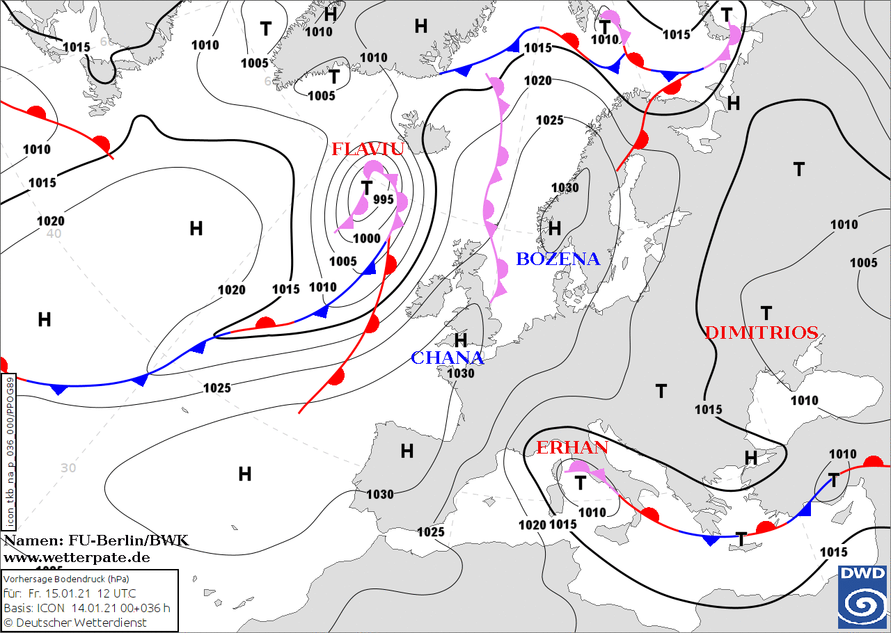 Noms des dépressions et anticyclones prévus pour vendredi 15 janvier 2021 à midi (Berlin)