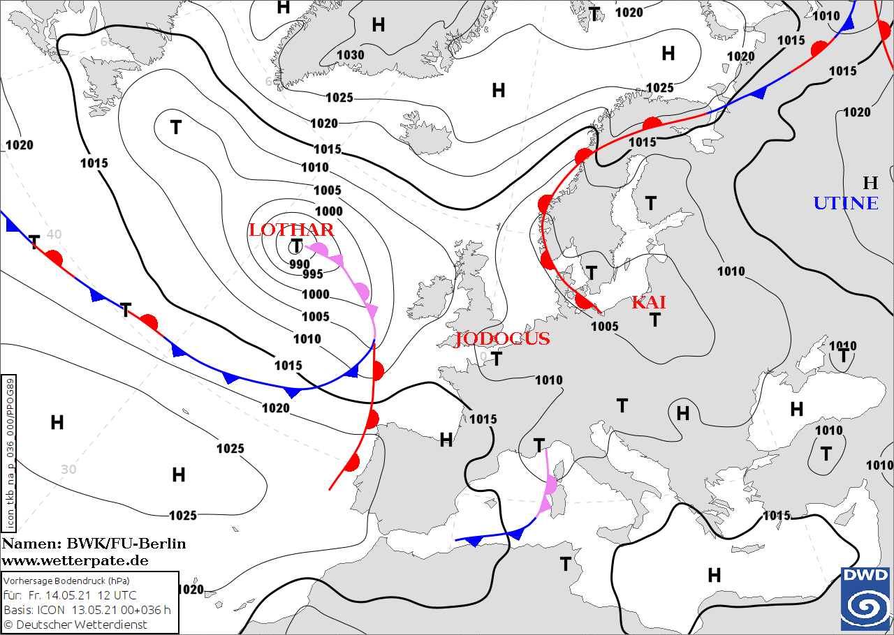 Noms des dépressions et anticyclones prévus pour vendredi 14 mai 2021 à midi (Berlin)