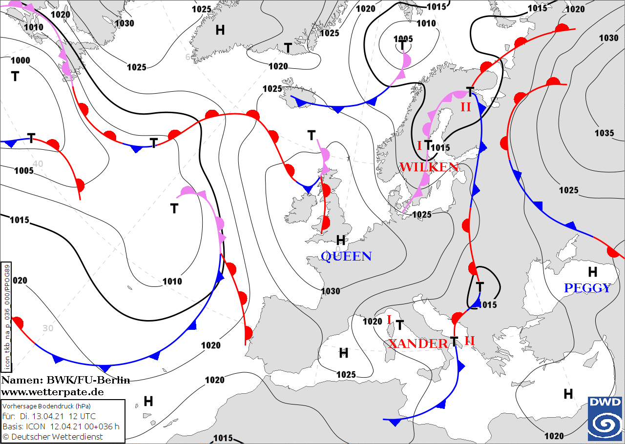 Noms des dépressions et anticyclones prévus pour mardi 13 octobre 2020 à midi (Berlin)