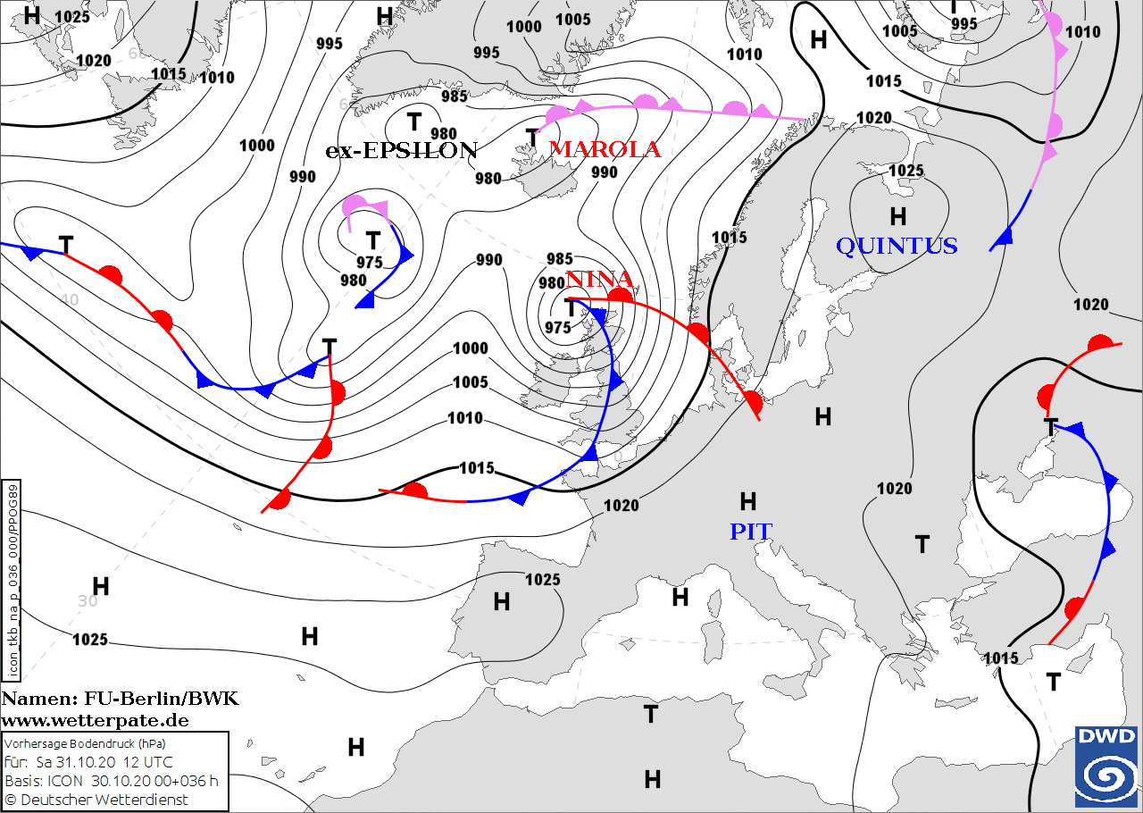 Noms des dépressions et anticyclones prévus pour samedi 31 octobre 2020 à midi (Berlin)