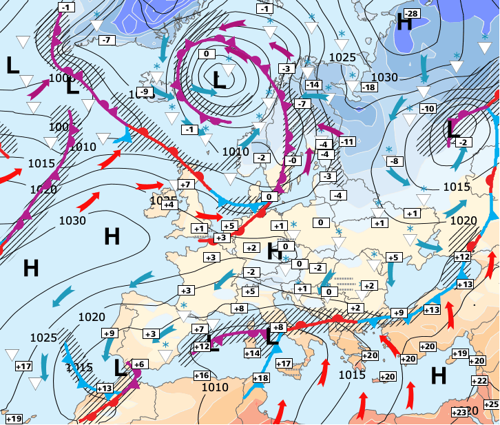 + D’autres vagues pluvieuses nous intéresserons mercredi et jeudi, mais la France se trouvera en limite de l’air très froid qui résistera toujours très bien sur l'Europe continentale.