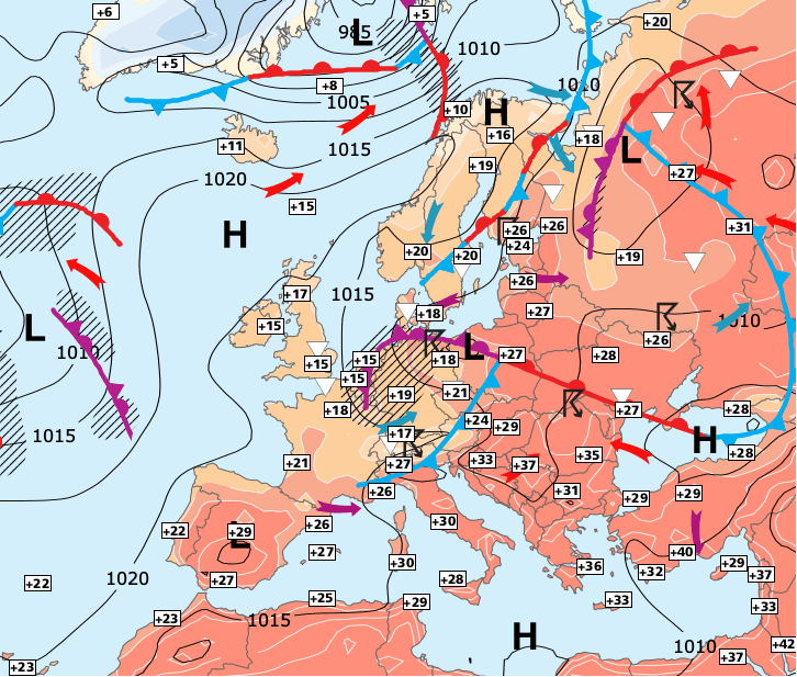 + Puis l’air océanique moins chaud et plus humide qui envahira à la France par l’Ouest, occasionnant une dégradation orageuse le week-end prochain.