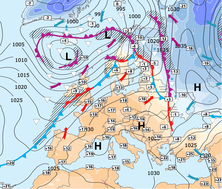+ Cette dépression glissera sous le mastodonte anticyclonique britannique et apportera des nuages, de l'humidité et un air plus frais.