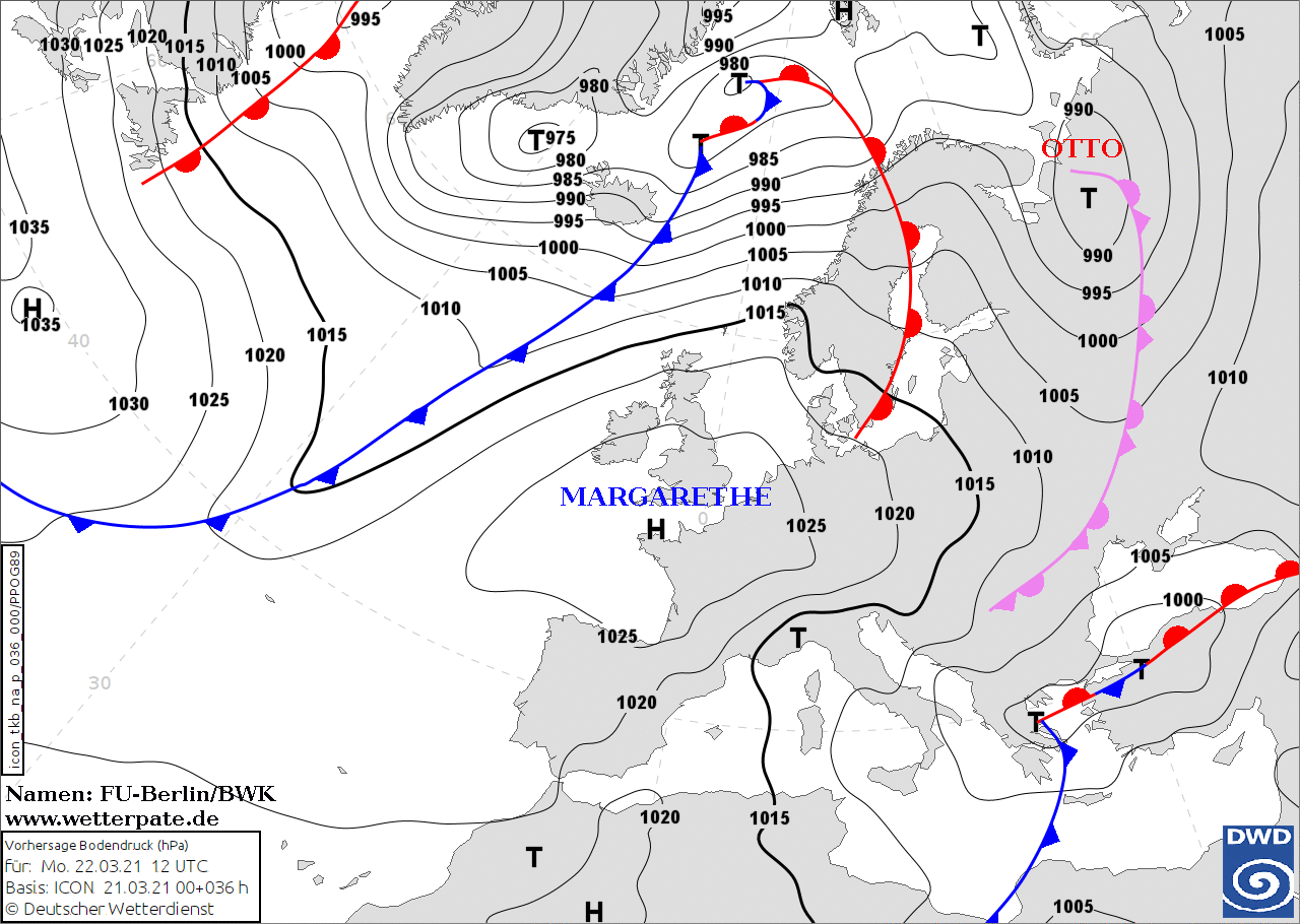 Noms des dépressions et anticyclones prévus pour lundi 22 mars 2021 à midi (Berlin)